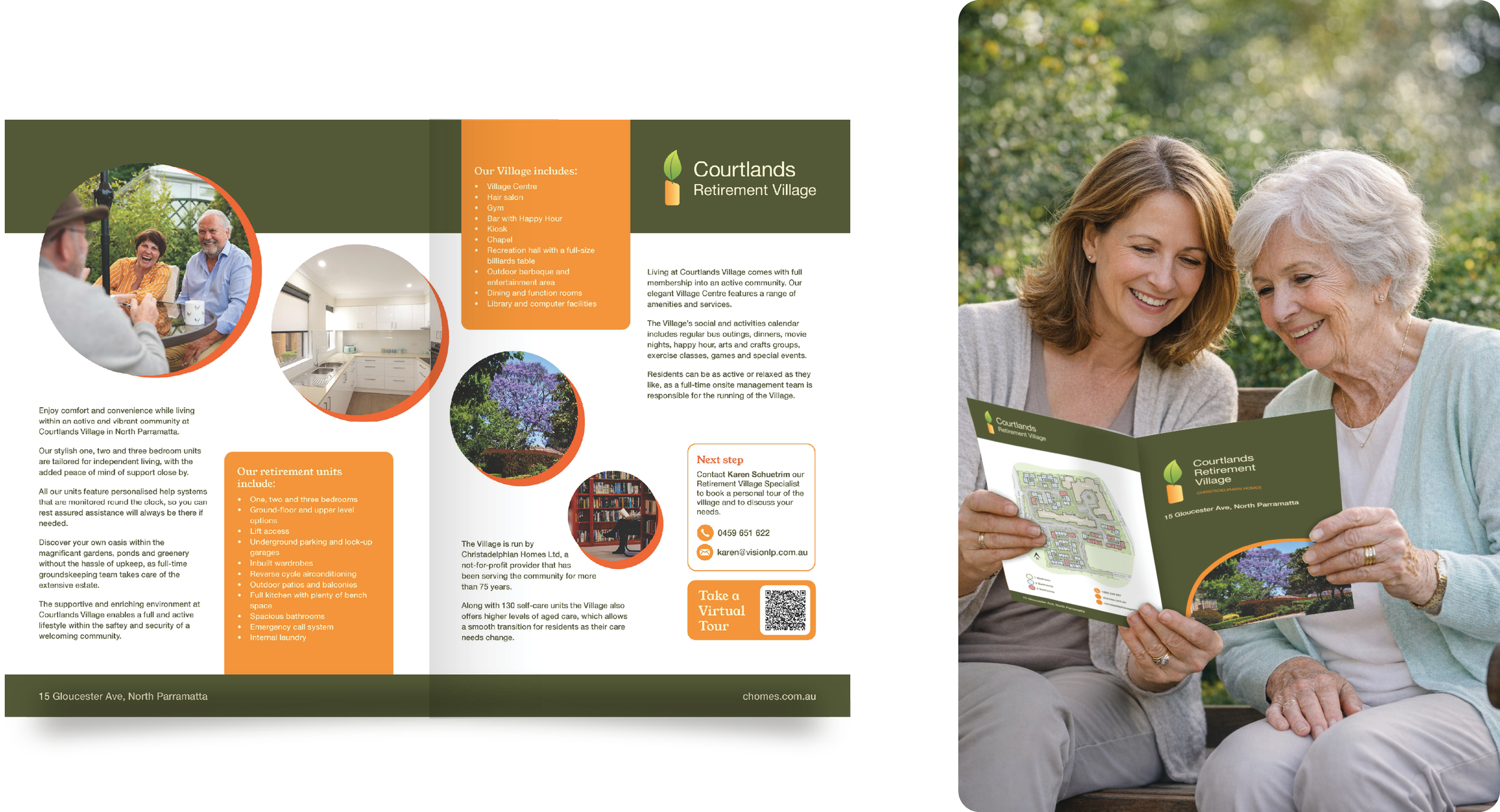 A brochure was created to encourage potential residents to get in contact with their Retirement Village Specialist. It featured circle framing devices and layered orange informational panels.
