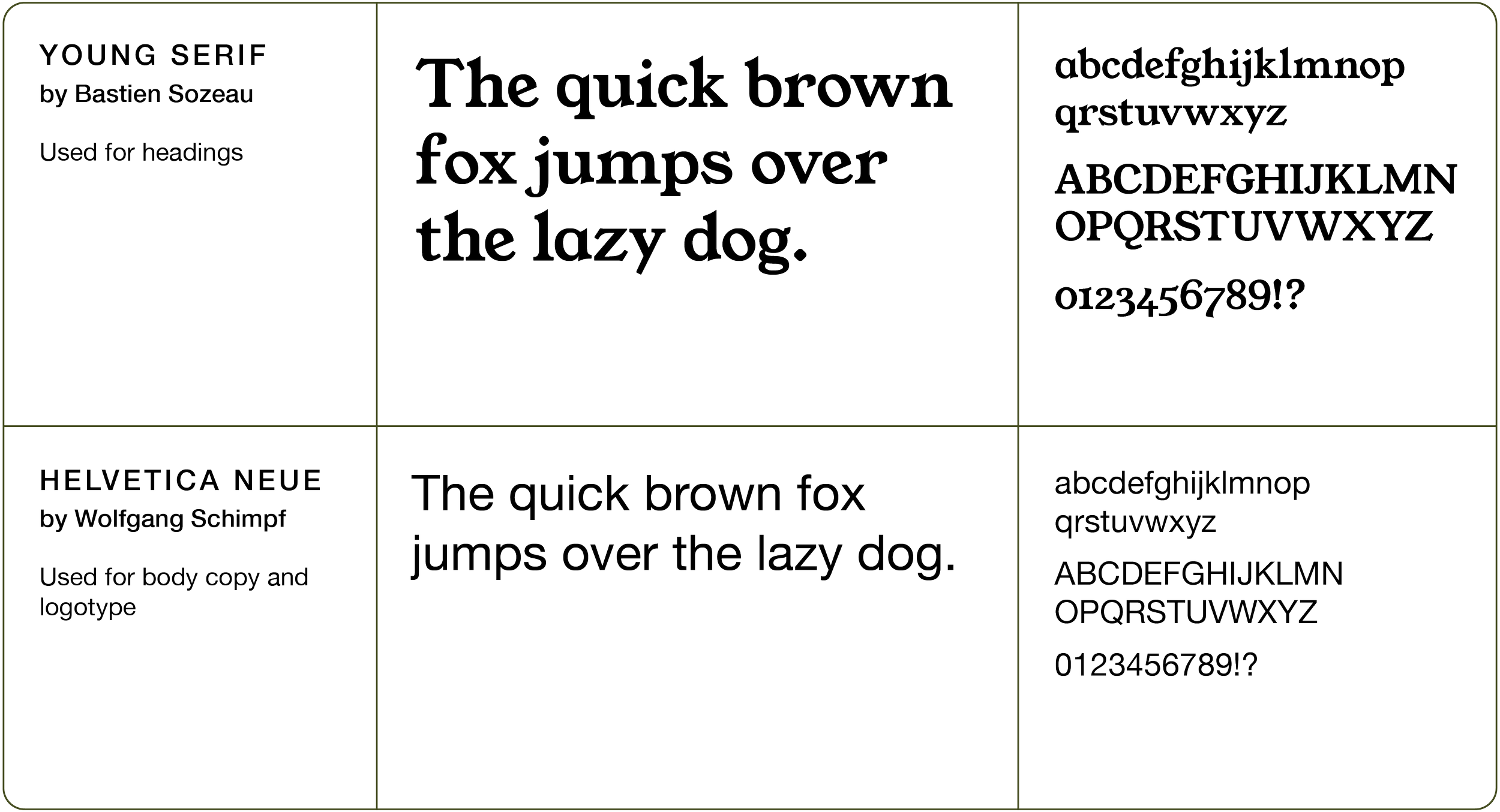Helvetica Neue was kept for body copy to tie in with the logotype. Young Serif was added to the family to add a fresh and interesting elements to their designs.